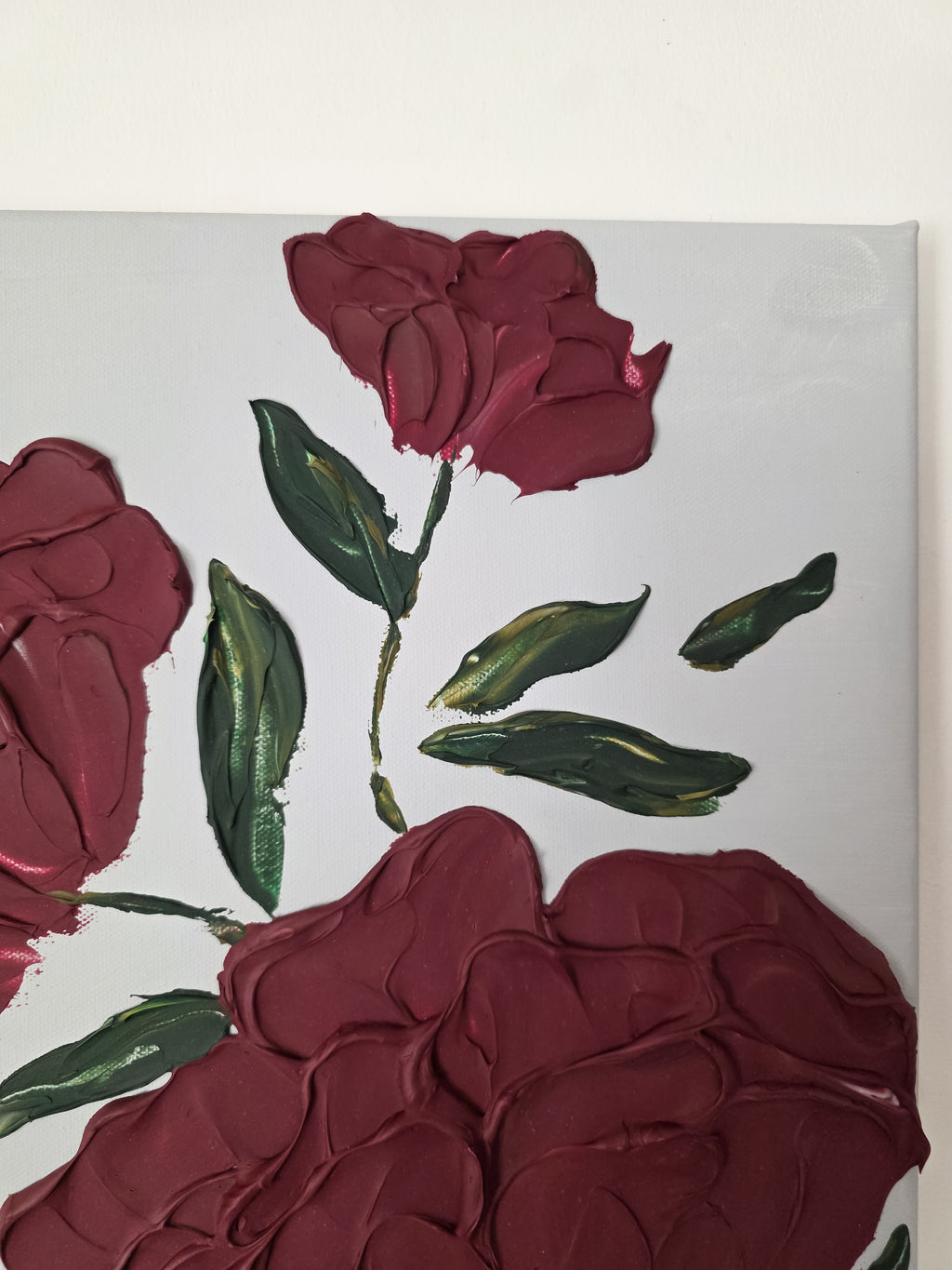 "Blooming in Burgundy” is a richly textured floral painting featuring bold burgundy blooms arranged with expressive palette-knife strokes. Each petal carries depth, dimension, and movement, creating a modern botanical artwork that feels both elegant and organic. The deep red florals contrast beautifully against the soft, neutral background, allowing the flowers to become the vibrant focal point of the piece.