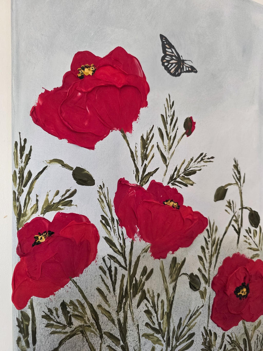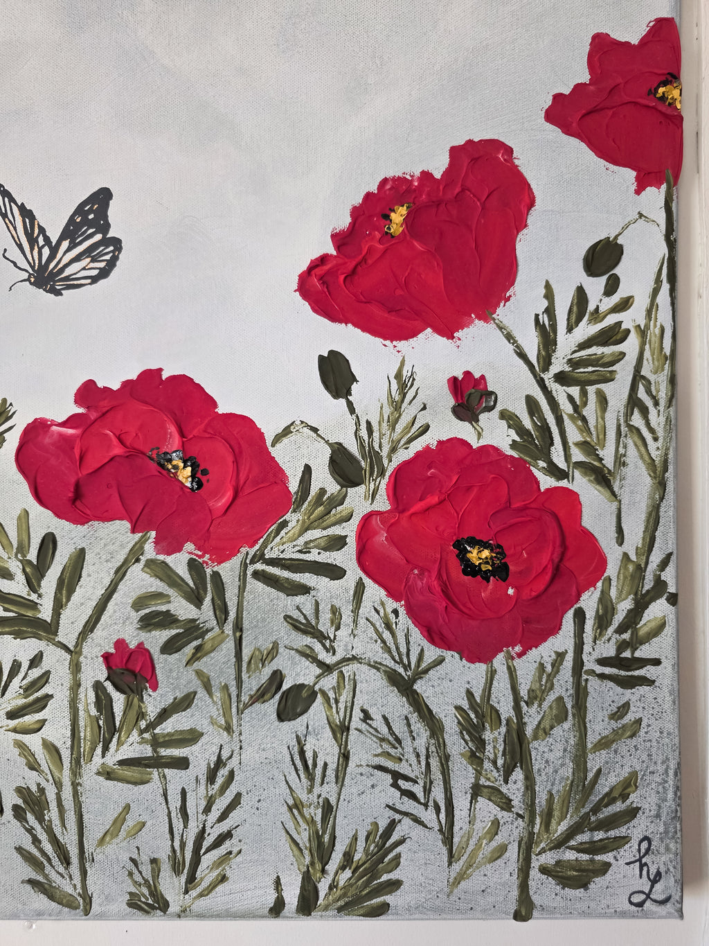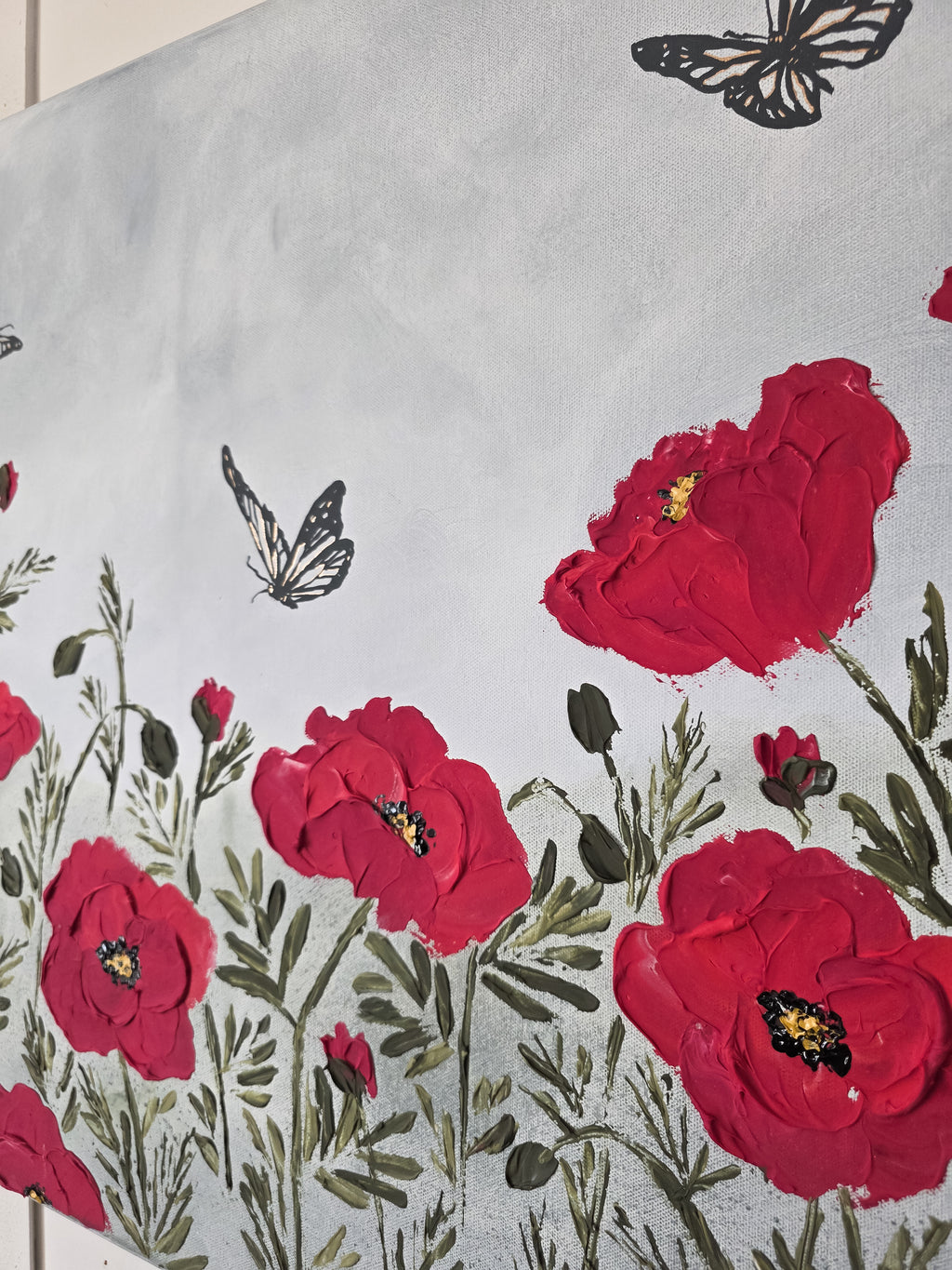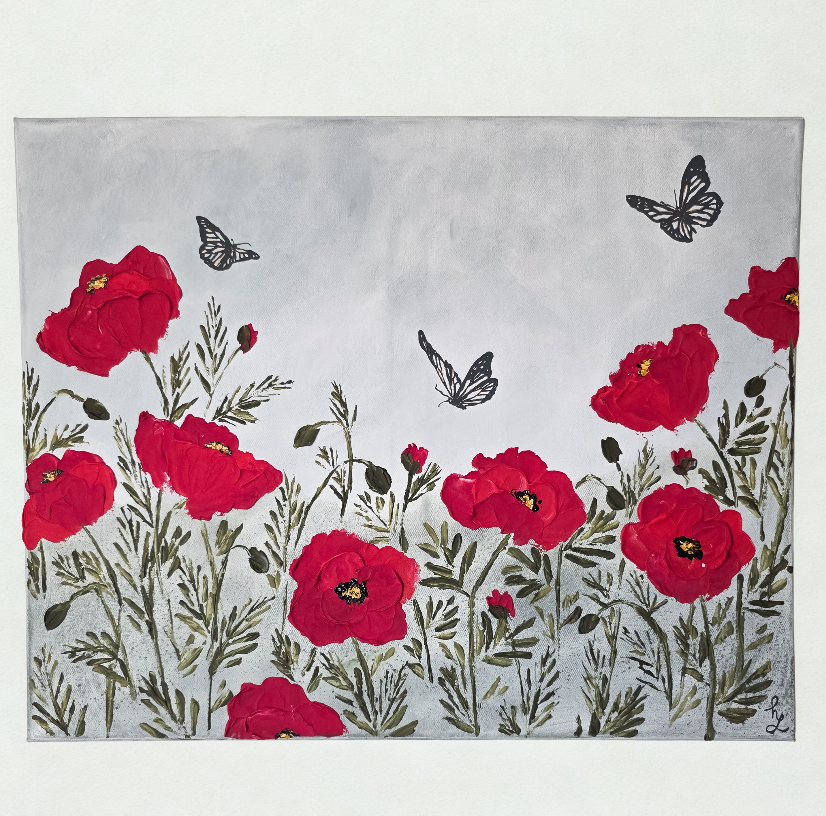I painted the sky with the quiet weight of a passing storm, the moment just after it breaks. Threads of gold run through the butterflies as a reminder that even through hardship, something beautiful can still emerge. The poppy - symbolizing healing after the pain. This painting holds so much meaning and is one of my most favorites. It holds so much of my heart. I hope it finds a place in yours, too. ❤️