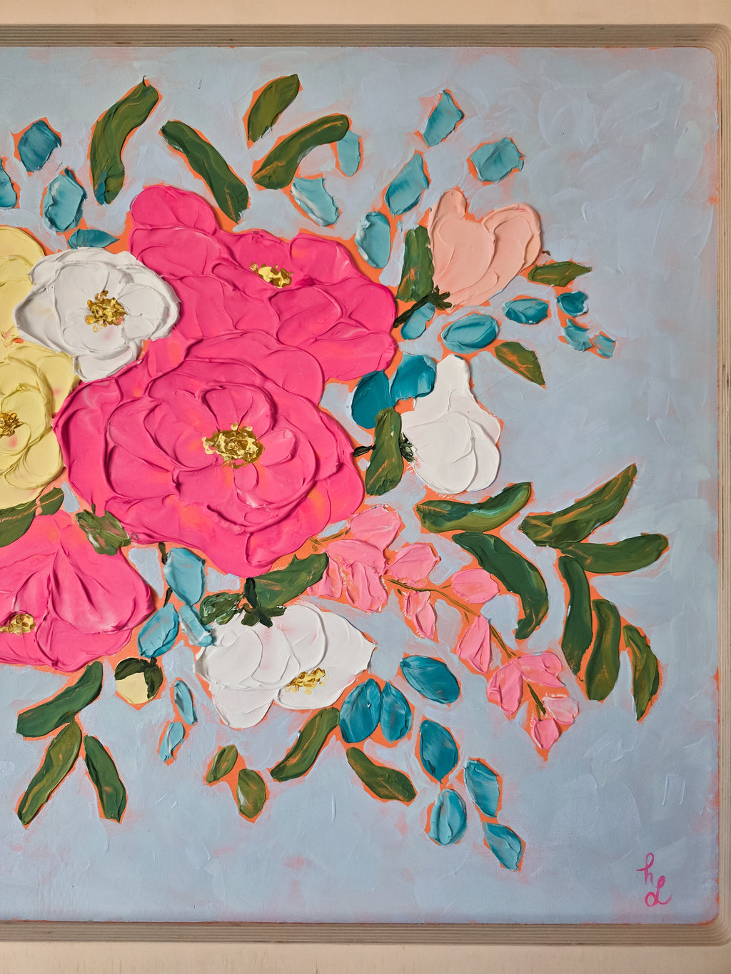 'Bright Blossoms" is a vibrant, textured floral painting featuring a joyful bouquet of pink, yellow, peach, and white blooms layered with rich palette-knife strokes. Set against a soft, airy background, the artwork blends modern color with classic floral elegance, creating a piece that instantly brightens any room.