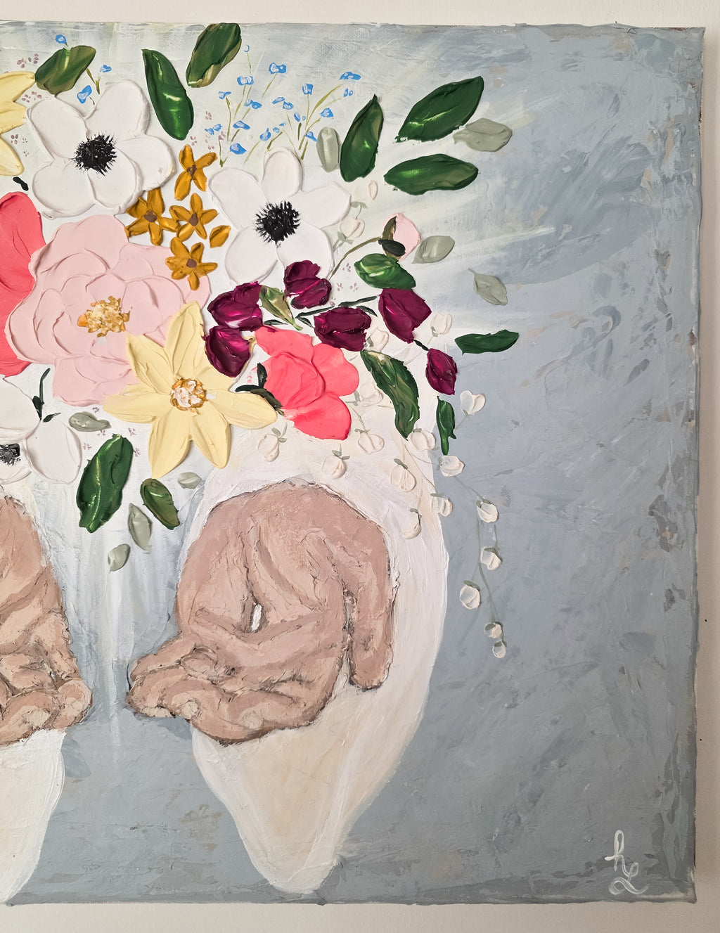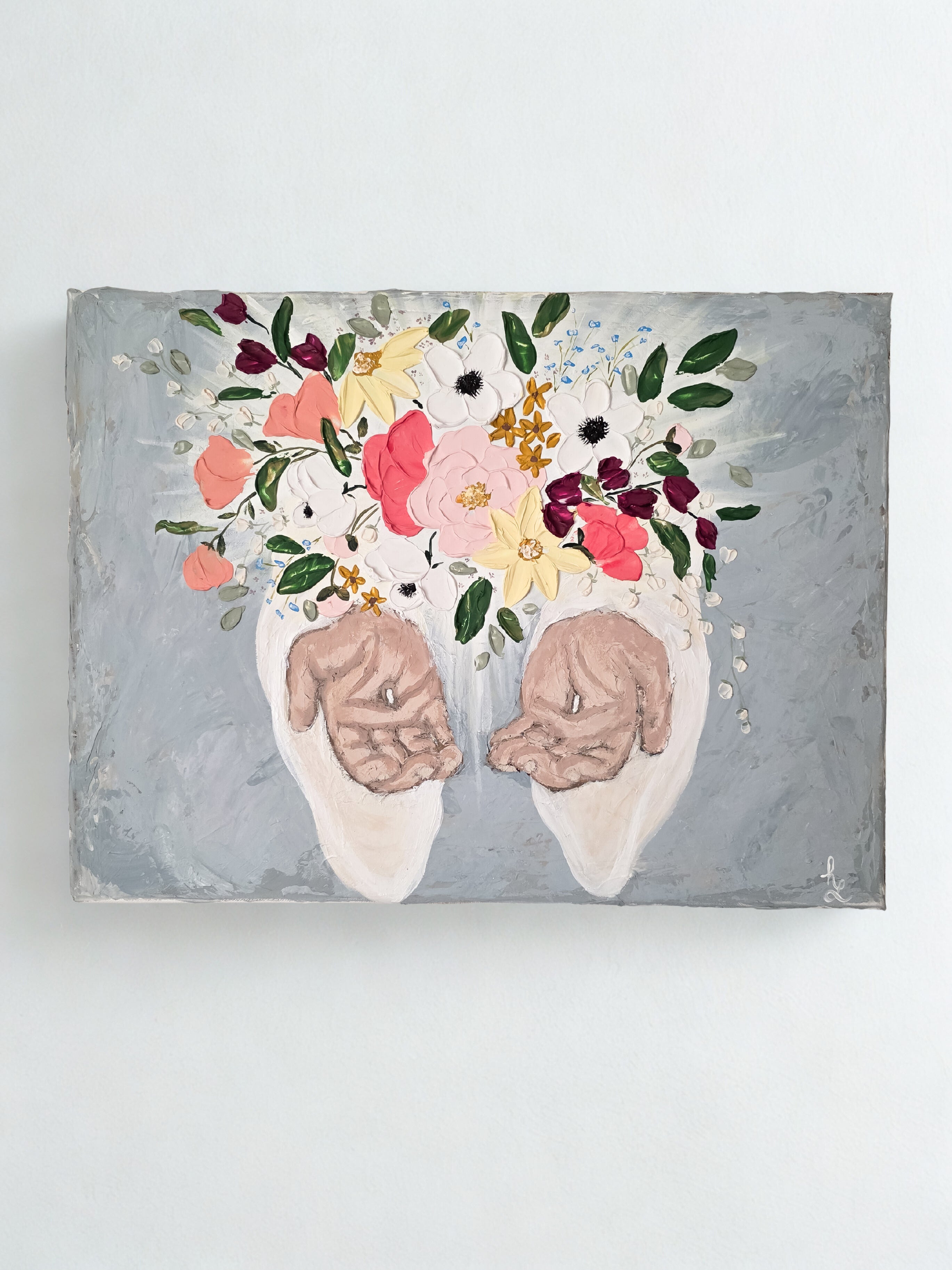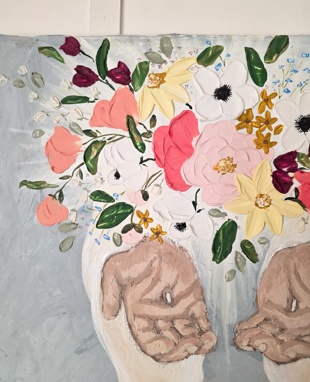 “Held in Grace” is an original textured acrylic painting portraying the compassionate, open hands of Jesus gently cradling an overflowing bouquet of vibrant flowers. Against a soft gray background, the artwork blends delicate florals with expressive brushwork to symbolize renewal, hope, and the beauty that blossoms when we place our burdens into His care.